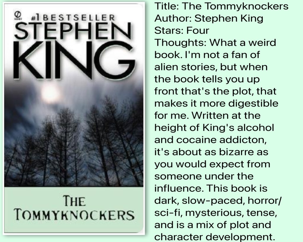 Categories books and reading The Tommyknockers Post author By pleasantnites Post date April 27, 2023 No Comments on The Tommyknockers Share this: Click to share on X (Opens in new window) X Click to share on Facebook (Opens in new window) Facebook Like Loading... Related By pleasantnites On Twitter @pleasant_nights View Archive → ← Ghettoside → Killers of a Certain Age Leave a comment Cancel reply Δ