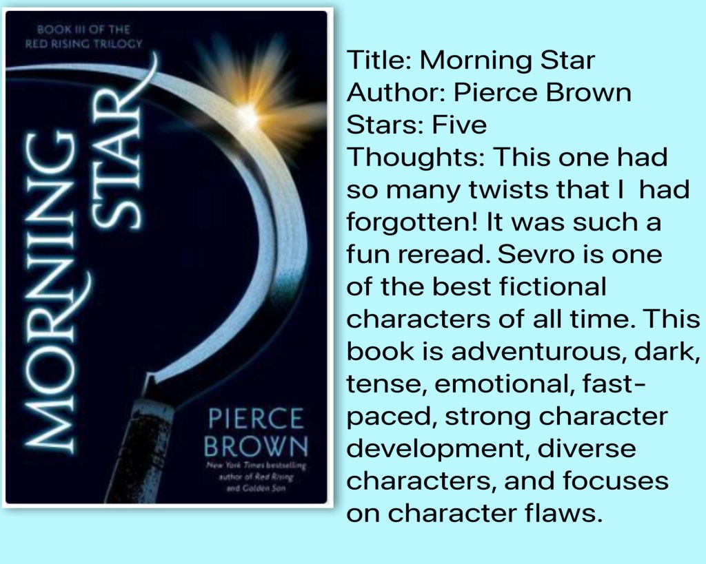 Categories books and reading Morning Star Post author By pleasantnites Post date July 9, 2023 No Comments on Morning Star Share this: Click to share on X (Opens in new window) X Click to share on Facebook (Opens in new window) Facebook Like Loading... Related By pleasantnites On Twitter @pleasant_nights View Archive → ← Such a Fun Age → The One and Only Ruby Leave a comment Cancel reply Δ
