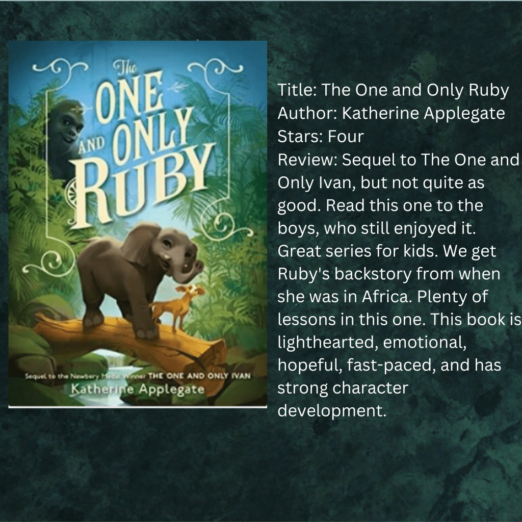 Categories books and reading The One and Only Ruby Post author By pleasantnites Post date July 21, 2023 No Comments on The One and Only Ruby Share this: Click to share on X (Opens in new window) X Click to share on Facebook (Opens in new window) Facebook Like Loading... Related By pleasantnites On Twitter @pleasant_nights View Archive → ← Morning Star → The Deluge Leave a comment Cancel reply Δ