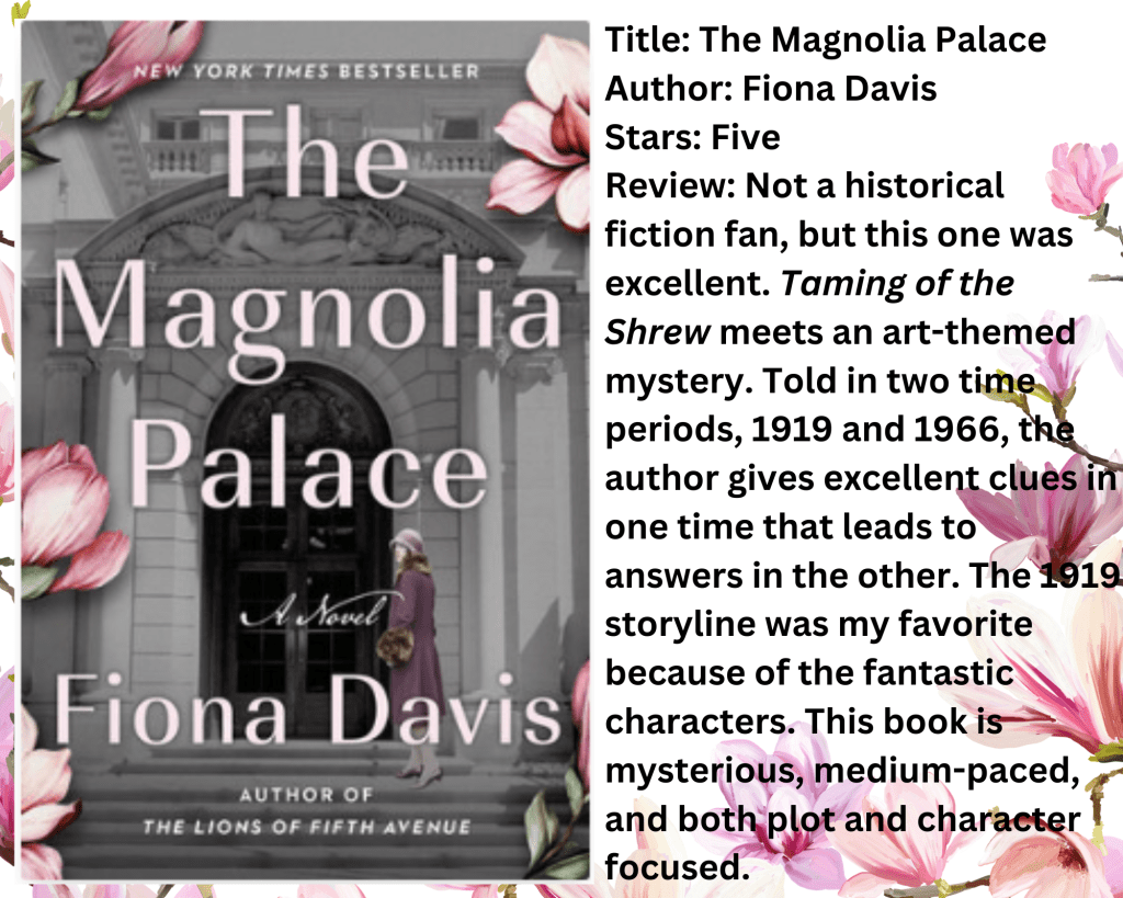 Categories books and reading The Magnolia Palace Post author By pleasantnites Post date September 10, 2023 No Comments on The Magnolia Palace