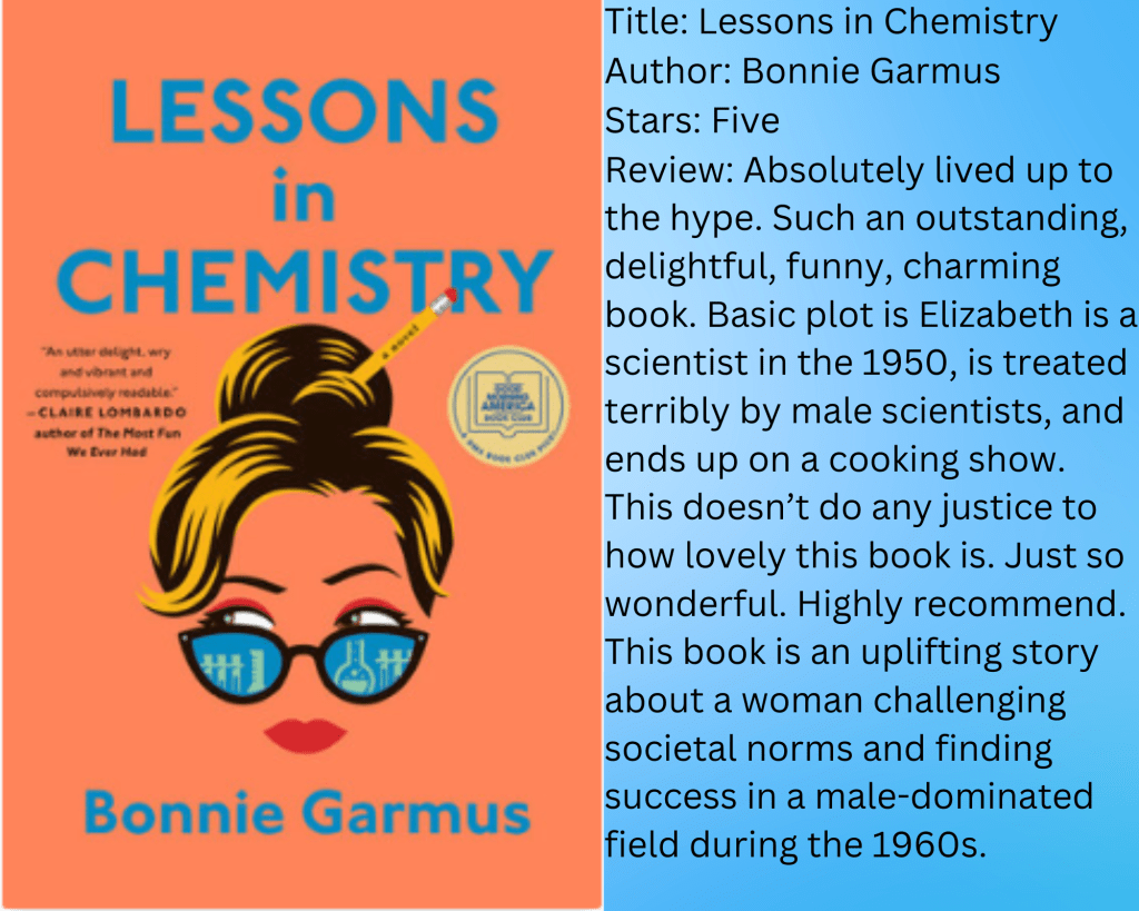Categories books and reading Lessons in Chemistry Post author By pleasantnites Post date April 12, 2024 No Comments on Lessons in Chemistry Share this: Click to share on X (Opens in new window) X Click to share on Facebook (Opens in new window) Facebook Like Loading... Related By pleasantnites On Twitter @pleasant_nights View Archive → ← Isolation Island → The Angel of Indian Lake Leave a comment Cancel reply Δ