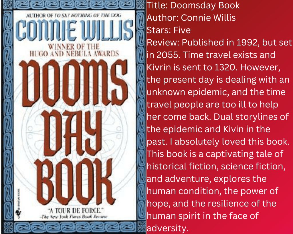 Categories books and reading The Doomsday Book Post author By pleasantnites Post date July 25, 2024 No Comments on The Doomsday Book Share this: Click to share on X (Opens in new window) X Click to share on Facebook (Opens in new window) Facebook Like Loading... Related By pleasantnites On Twitter @pleasant_nights View Archive → ← Goodnight Beautiful → Dear Laura Leave a comment Cancel reply Δ