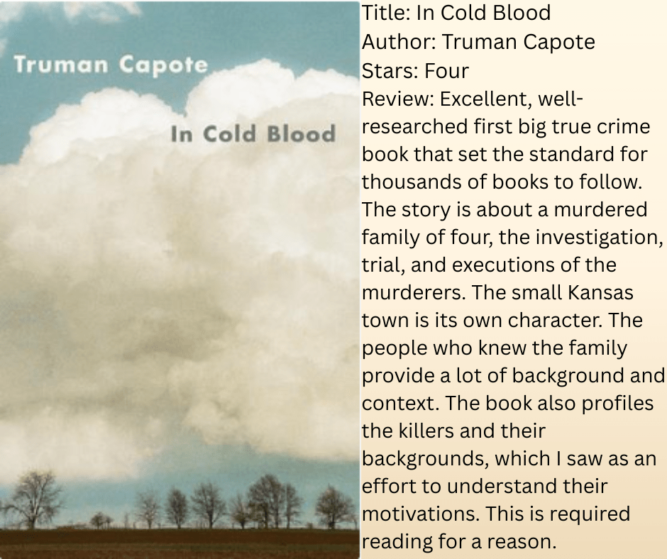 Categories books and reading In Cold Blood Post author By pleasantnites Post date April 14, 2026 No Comments on In Cold Blood Share this: Share on X (Opens in new window) X Share on Facebook (Opens in new window) Facebook Like Loading... Related By pleasantnites On Twitter @pleasant_nights View Archive → ← Listen to Your Sister → Small Town Horror Leave a comment Cancel reply Δ